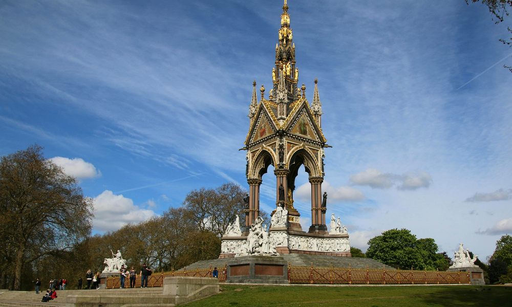 One of the highlights is the majestic Albert Memorial, commissioned by Queen Victoria in honor of Prince Albert. Richly ornamented and adorned with golden details, the monument stands as an impressive tribute filled with historical symbolism.